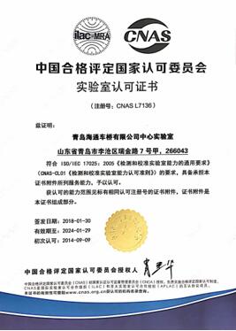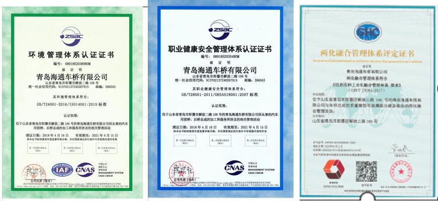 青島海通車橋有限公司成立于1994年,注冊(cè)資金2000萬元,位于山東省青島市即墨區(qū)解放二路106號(hào)。公司先后獲得“中國誠信企業(yè)”、“國家級(jí)認(rèn)可實(shí)驗(yàn)室”、“高新技術(shù)企業(yè)”、“山東省企業(yè)技術(shù)中心”、“山東省守合同重信用企業(yè)”、“山東省著名商標(biāo)”、“質(zhì)量信用AAAAA級(jí)企業(yè)”、“AAA級(jí)企業(yè)信用等級(jí)”等榮譽(yù)。先后通過了質(zhì)量、環(huán)境、職業(yè)健康安全、兩化融合等管理體系認(rèn)證。